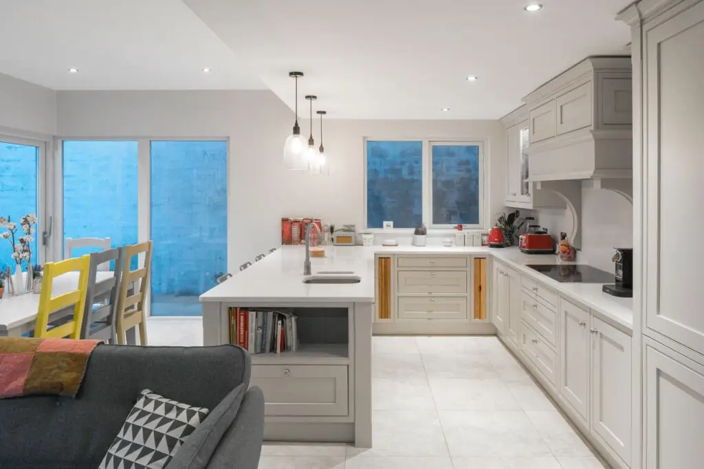 You can work and store a lot in a U-shaped kitchen with an island. The island in the middle is ideal for cooking, preparing food, and having informal meals. Three sides are surrounded by worktops and cabinets that make everything easily accessible. For extra convenience, you may install a sink or set up the island as a breakfast bar. This arrangement is most effective in medium-sized to large kitchens where there is ample room to walk freely about the island. Everyone in the family will find cooking and socializing to be simple and pleasurable because of its excellent mixture of functionality and artistic flair.