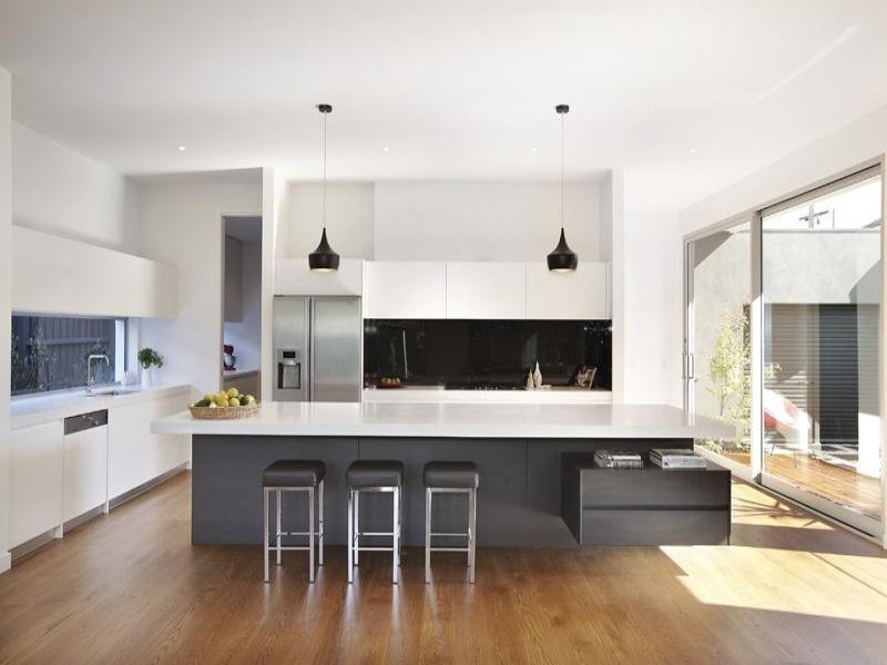 One of the most common kitchen layouts for modern houses is an L-shaped kitchen with an island. A natural work triangle is formed between the sink, stove, and refrigerator by the two linked slabs that create a “L.” Additional counter space, storage, and seating are all provided by the island. Because it divides the kitchen from the living or dining space, it’s an ideal choice for open-plan houses. The island may also be used for entertaining visitors, doing homework, and preparing fast meals. Everything is kept within easy reach thanks to this design, which also promotes simple mobility and communication.